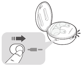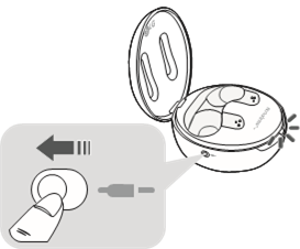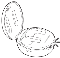 - Öffnen Sie die Abdeckung des Lade-Cases, während die Ohrhörer darin eingesetzt sind. Halten Sie das Touchpad des linken oder rechten Ohrhörers 3 bis 5 Sekunden lang gedrückt, bis die Akkuanzeige blau blinkt.