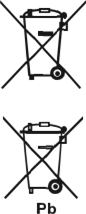 - Dieses Symbol kann mit chemischen Symbolen für Quecksilber (Hg), Cadmium (Cd) oder Blei (Pb) kombiniert werden, wenn die Batterie mehr als 0,0005 % Quecksilber, 0,002 % Cadmium oder 0,004 % Blei enthält.
