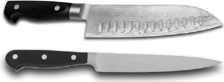 Οι πιο δημοφιλείς ασιατικές λεπίδες. τα λεπτά, ελαφριά Santoku και Nakiri για παράδειγμα είναι γενικά διπλής όψης (ακονισμένα και στις δύο όψεις της λεπίδας) όπως φαίνεται στο Σχήμα 10b. Περιστασιακά, τα μαχαίρια Santoku πωλούνται με μονές όψεις (Σχήμα 10c), αλλά αυτά δεν είναι άμεσα διαθέσιμα στις Ηνωμένες Πολιτείες.
