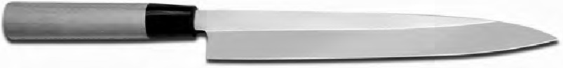 Το παραδοσιακό ιαπωνικό μαχαίρι είναι μονής λοξότμησης και έχει μια φαρδιά εργοστασιακή λοξότμηση A κατά μήκος μιας όψης της λεπίδας πάνω από μια μικρή όψη ακμής. Αυτά πωλούνται είτε ως εκδόσεις δεξιού χεριού είτε ως αριστερού χεριού, όπως φαίνεται στο Σχήμα 10c. Η μεγάλη φαρδιά εργοστασιακή λοξότμηση A είναι λειασμένη, συνήθως σε περίπου 10 μοίρες. Το πιο δημοφιλές παράδειγμα αυτού του τύπου λεπίδας είναι το μαχαίρι sashimi γνωστό και ως Yanagi και Takohiki, σχεδιασμένο όπως φαίνεται στα δεξιά. Αυτή η μακριά λεπίδα κοπής είναι ιδανική για την προετοιμασία πολύ λεπτών φετών ωμού τόνου ή σολομού. Η πίσω πλευρά αυτής της λεπίδας είναι συνήθως ελαφρώς κοίλη λειασμένη. Μια μικρή ενιαία όψη κοπτικής ακμής περίπου 15º δημιουργείται κατά μήκος της μπροστινής πλευράς της ακμής της λεπίδας sashimi όπως φαίνεται στα Σχήματα 10c και 10d για να καθοριστεί η γεωμετρία της κοπτικής ακμής. Μια ακόμη μικρότερη μικρο-όψη κοπής (μόλις ορατή με γυμνό μάτι) δημιουργείται συνήθως στην πίσω όψη της λεπίδας για να ενισχυθεί η ευκρίνεια της τελικής ακμής. Το Σχήμα 10d δείχνει μια πολύ μεγεθυμένη διατομή μιας τυπικής εργοστασιακής ακμής στο παραδοσιακό ιαπωνικό μαχαίρι μονής λοξότμησης. Η μεγάλη εργοστασιακή λοξότμηση A χρησιμεύει για να εκτρέψει τη φέτα τροφής μακριά από τη λεπίδα καθώς κόβεται. Όταν ακονίζετε τις παραδοσιακές ιαπωνικές λεπίδες, ακολουθείτε πάντα προσεκτικά τις οδηγίες. Επίσης, να θυμάστε ότι αυτά τα μαχαίρια θα είναι εξαιρετικά αιχμηρά.