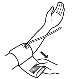 - Εφαρμόστε την περιχειρίδα στο αριστερό πάνω μέρος του χεριού σας έτσι ώστε το βέλος να είναι κεντραρισμένο στο εσωτερικό του χεριού σας και να είναι ευθυγραμμισμένο με το μεσαίο δάχτυλό σας. Ο σωλήνας αέρα κατεβαίνει κατά μήκος του εσωτερικού του χεριού σας. Το κάτω μέρος της περιχειρίδας πρέπει να βρίσκεται περίπου 1 έως 2 cm πάνω από τον αγκώνα σας.
