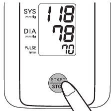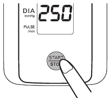 Ξεκινά η μέτρηση. - Όταν η περιχειρίδα αρχίσει να φουσκώνει, πατήστε και κρατήστε πατημένο το κουμπί START/STOP (ΕΝΑΡΞΗ/ΔΙΑΚΟΠΗ) μέχρι η οθόνη να φουσκώσει 30 έως 40 mmHg υψηλότερα από την αναμενόμενη συστολική σας πίεση.