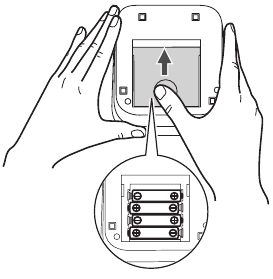 στο κάλυμμα της μπαταρίας και σύρετε το κάλυμμα προς την κατεύθυνση του βέλους. - Τοποθετήστε 4 μπαταρίες μεγέθους "AAA" έτσι ώστε οι πολικότητες + (θετική) και - (αρνητική) να ταιριάζουν με τις πολικότητες της θήκης μπαταριών όπως υποδεικνύεται.