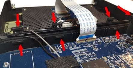 | Ανασηκώστε το πάνω μέρος του περιβλήματος κλίνοντάς το μόνο από το πίσω μέρος της συσκευής, μέχρι να ακούσετε δυνατά "κλικ". Στη συνέχεια, ανασηκώστε το προς τα πάνω, προσέχοντας να μην σπάσετε τις ταινίες και τα καλώδια. | |
