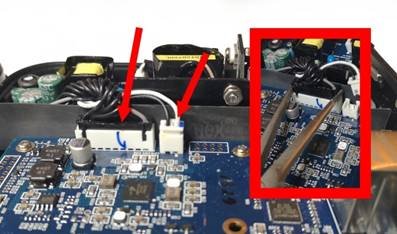 | Αποσυνδέστε τη μικρή και τη μεγάλη υποδοχή. Μπορείτε να χρησιμοποιήσετε μακρύτερες πένσες για αυτό. | |