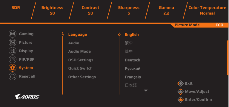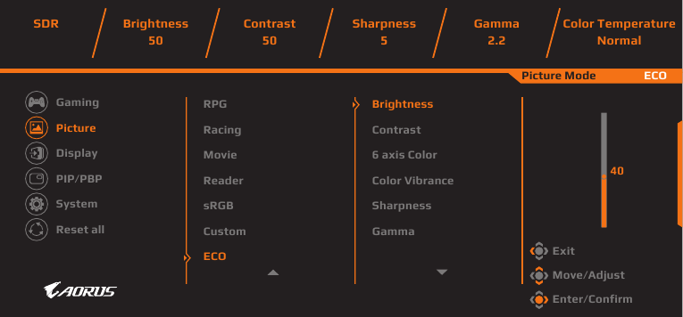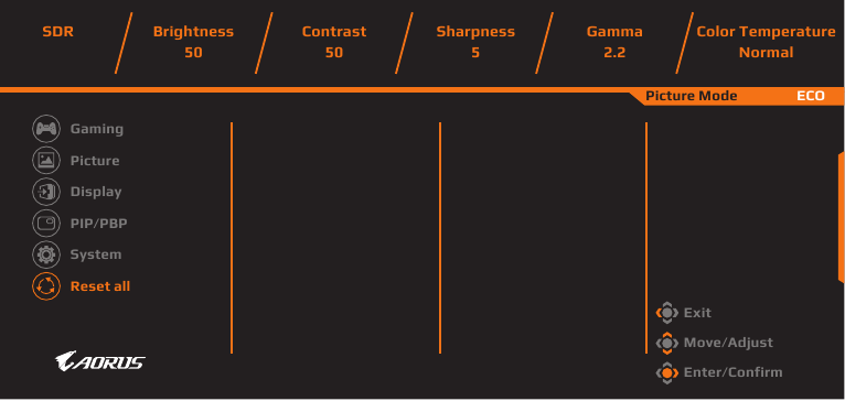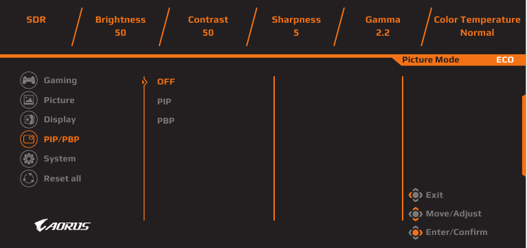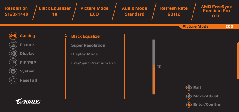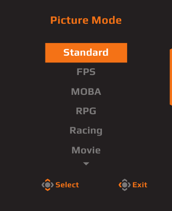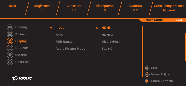 | Display Mode | Επιλέξτε την αναλογία διαστάσεων της οθόνης. Σημείωση: Αυτή η επιλογή δεν είναι συμβατή με τις λειτουργίες AMD FreeSync Premium Pro και PIP/PBP. |