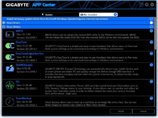 Αφού εγκαταστήσετε το λειτουργικό σύστημα, θα εμφανιστεί ένα παράθυρο διαλόγου στην κάτω δεξιά γωνία της επιφάνειας εργασίας, το οποίο θα σας ρωτήσει αν θέλετε να κατεβάσετε και να εγκαταστήσετε τα προγράμματα οδήγησης και τις εφαρμογές GIGABYTE μέσω του APP Center. Κάντε κλικ στο Install (Εγκατάσταση) για να συνεχίσετε την εγκατάσταση. (Στο BIOS Setup, βεβαιωθείτε ότι η Advanced\APP Center Download & Install Configuration\APP Center Download & Install έχει οριστεί σε Enabled.)