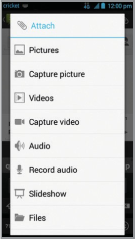 Menu (Μενού) key (πλήκτρο) > Attach (Επισύναψη) file (αρχείο) και κάντε την επιλογή σας. - Πατήστε Send (Αποστολή) για να στείλετε το μήνυμα.