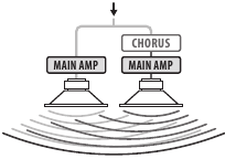This uses two completely independent amps and speakers; one amp and speaker output the direct sound that is sent from the guitar, while the other amp and speaker output a sound that is subtly pitch-modulated. These two sounds are mixed in the air, creating a softly spacious three-dimensional effect that is warm, deep, and natural-sounding.