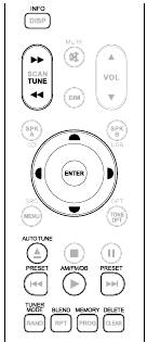 ]: In DAB mode, in combination with TUNER MODE (tuner mode) or other compatible buttons, toggle to select through DAB feature options like Dynamic Range Control, Station Order and other appropriate DAB options.
