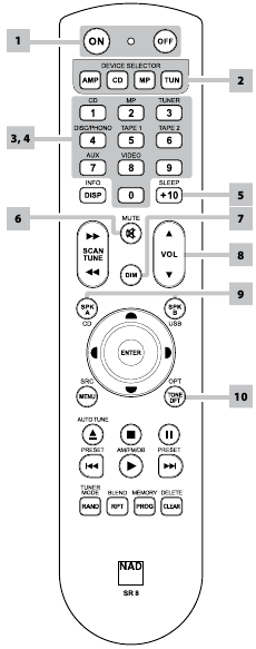 TUNER CONTROL (for use with NAD AM/FM/DAB Tuner): Set the DEVICE SELECTOR to "TUN" in order to gain access to these buttons. Refer to the corresponding labels printed in the remote control faceplate and their respective assigned buttons to make use of these functions. Some of the control buttons below are applicable only to specific NAD Receiver or Tuner models; check the owner's manual of your NAD Receiver or Tuner for control button compatibility.