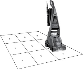 - Push power pedal on and fully recline handle. Press spray trigger for 15 seconds while making forward and backward passes on the carpet. Release spray trigger and make forward and backward passes for another 15 seconds or until there is no more water being suctioned up from carpet.