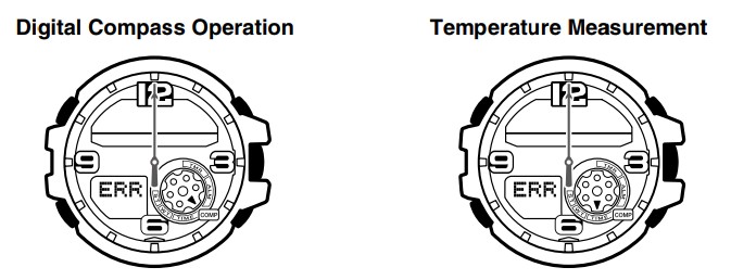 Subjecting the watch to strong impact can cause sensor malfunction or improper contact of internal circuitry. When this happens, ERR (error) will appear on the display and sensor operations will be disabled.
