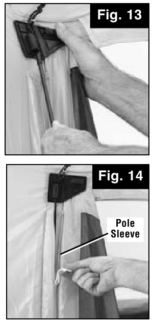 - Assemble Door Pole (longer black pole with plastic cap tips); then insert into zippered sleeve at top of door. (Fig. 15)