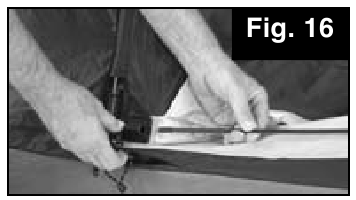 - Insert end of Door Pole into top hinge plate, apply pressure to form a bow, then insert other tip of pole into the bottom hinge. (Fig. 16)