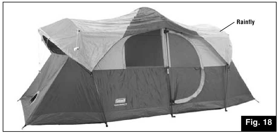 - Drape Rainfly over tent. Make sure seams on Rainfly are facing down and centred over poles of the tent. (Fig. 18)