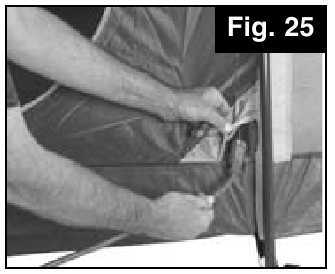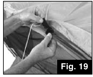 - Locate all hook & loop fasteners on underside of Rainfly and wrap around each Leg Pole and Window Vent Pole locations. (Fig. 19)
