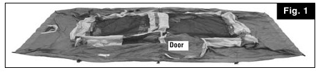 - Unfold tent and spread out on a clean, level surface with the door facing the desired direction. Unzip doors. (Fig. 1)