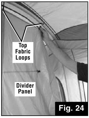 - Divider Panel can be installed through centre of the tent by inserting toggles through the top and bottom fabric loops as shown. (Fig. 23 & 24)