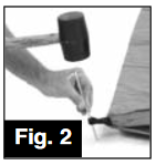 - Pull four corners of tent taut, then secure by driving stakes through web loops at an angle for better anchoring. (Fig. 2)