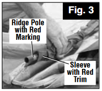 - Assemble three, steel, shock-corded, curved Ridge Poles. Insert Ridge Pole (with red marking) into centre sleeve on top of tent with the red trim (Fig. 3). Insert the remaining curved Ridge Poles into the other two sleeves on top of tent.