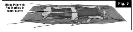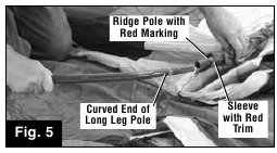 - Insert curved end of Leg Poles (with red marking) into the ends of the Ridge Pole (with red marking). Insert curved end of remaining short Leg Poles into the ends of the remaining Ridge Poles. (Fig. 5 & 6)