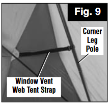 - Locate web strap with plastic hook on the sides of each end panel Window Vent, then snap onto the corner Leg Pole. (Fig. 9)