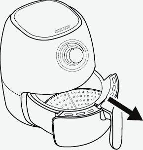 Never immerse the Air Fryer or its plug in water or any other liquids. - Pull the Basket Handle to remove the basket from the Air Fryer. Use the Tray Handle, in the center of the tray, to remove the tray. Use a sponge and warm, soapy water to wash the inside and outside of the basket and tray. The basket and the tray are top-rack dishwasher safe. Do NOT use abrasive cleaning agents or scouring pads.