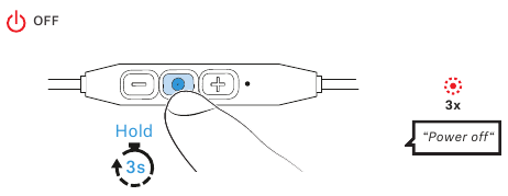 You hear the voice prompt "Power off" (power off) and the LED flashes red 3 times.