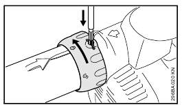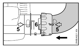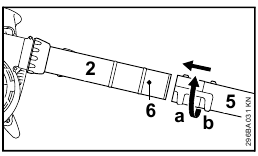 - Push nozzle (5) onto blower tube (2) as far as lug (6), position (a) (long) or position (b) (short), and rotate nozzle in direction of arrow to lock in position.