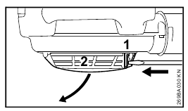 - Insert screwdriver in the tab (1) and press down to disengage the intake screen (2) and then open the intake screen.