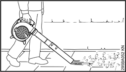 The fan nozzle (either included with unit or available as special accessory) produces a broad and powerful airstream at ground level. It can be aimed and controlled very accurately. This nozzle is highly effective for blowsweeping sawdust, leaves, grass cuttings, etc. on paved surfaces.