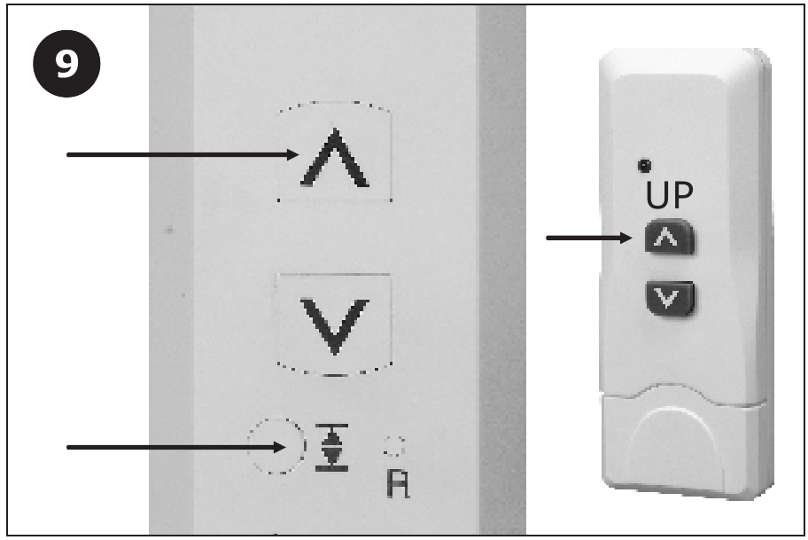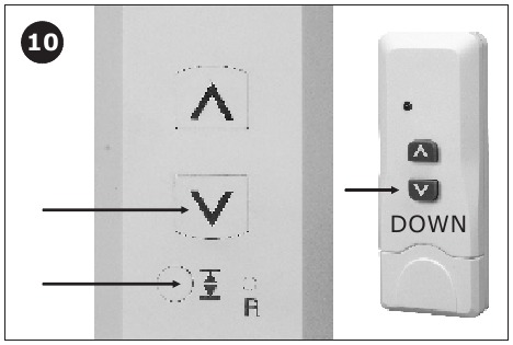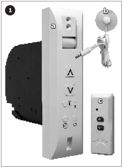 - Press the ▲ "Up" (up) or ▼ "Down" (down) button on your remote (1c), if learning is correct the 2 LED's will turn off. If you don't press any buttons before the LED's turn off the device will exit the learning mode. A maximum of 5 remotes can be learned to the shutter/screen motor