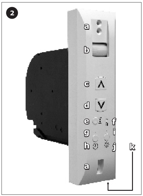 - To set the sunlight level, press the "Set" (set) button (2e) and "Light" (light) button (2j) at the same time. The "Light" (light) indicator LED (2i) will blink for ten seconds, sensing the current sunlight intensity