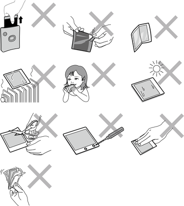 - Evite el escaneo de equipaje facturado en el aeropuerto y otras exposiciones fuertes a rayos X. El efecto de empañamiento, etc. puede aparecer en la película sin usar. Recomendamos que lleve la impresora y/o la película en el avión como equipaje de mano. (Consulte con cada aeropuerto para obtener más información).