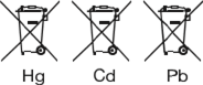 En el caso de baterías, acumuladores y pilas de botón que contengan más de 0,0005 de mercurio, más de 0,002% de cadmio o más de 0,004% de plomo, se marcarán con el símbolo químico del metal en cuestión: Hg, Cd o Pb respectivamente. Consulte el siguiente símbolo:
