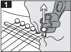 Cada cuerda pasa a través del cuerpo y se sujeta con clavijas de puente Ibanez Advantage™. Para quitar una clavija de puente, primero debe girar el clavijero para aflojar la cuerda lo suficiente, luego use sus dedos o un removedor de clavijas de puente disponible comercialmente (fig. 1) para quitar la clavija con cuidado para no dañar el puente o la clavija de puente, y finalmente extraiga el extremo de bola de la cuerda vieja.