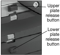 - Presione los botones de liberación de la placa para quitar las placas de la carcasa. Asegúrese de que las placas se hayan enfriado por completo antes de manipularlas (al menos 30 minutos). Las placas de cocción se pueden lavar en el lavavajillas. No utilice objetos metálicos, como cuchillos o tenedores, para la limpieza. No utilice una almohadilla de estropajo para la limpieza; el revestimiento antiadherente puede dañarse.