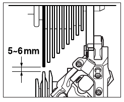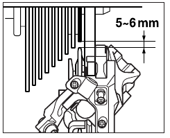 Ajuste el desviador trasero a la posición de marcha más baja, evite que la rueda gire y, a continuación, compruebe que la distancia desde el borde de la polea guía hasta el borde del piñón más grande esté dentro del rango de 5 a 6 mm. Gire el brazo de la biela para cambiar de marcha y compruebe que no haya aspereza en la sensación. Si se cambia el número de dientes del piñón del cassette, vuelva a realizar este ajuste.