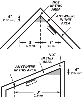 - Instale alarmas de humo en techos inclinados, en punta o en forma de catedral en o dentro de los 3 pies (0.9 m) del punto más alto (medido horizontalmente). La NFPA 72 establece: "Las alarmas de humo en habitaciones con pendientes de techo superiores a 1 pie en 8 pies (0.3 m en 2.4 m) horizontalmente se ubicarán en el lado alto de la habitación". La NFPA 72 establece: "Se espaciará y ubicará una fila de detectores dentro de los 3 pies (0.9 m) del pico del techo medido horizontalmente" (consulte la figura 2).