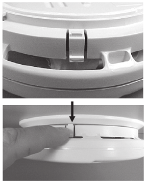Para reemplazar la batería, retire la alarma del anillo de adorno girando la alarma en la dirección de la flecha "OFF" en la cubierta. Para desconectar el arnés de alimentación de CA, apriete los brazos de bloqueo en los lados del conector rápido mientras tira del conector alejándolo de la parte inferior de la alarma (consulte la sección INSTRUCCIONES DE INSTALACIÓN, figura 5).