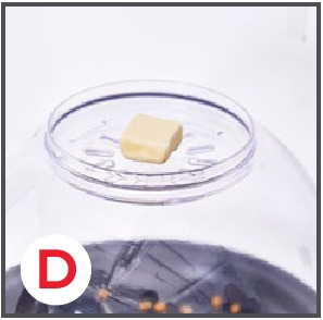 NOTA: NO coloque la taza medidora en la parte superior de la máquina para hacer palomitas de maíz, ya que los orificios de ventilación deben permanecer abiertos durante la cocción. - Para obtener un sabor a mantequilla adicional, agregue un trozo de mantequilla en la parte superior del tazón (donde se encuentran los orificios de ventilación) para que se caliente mientras cocina (foto D).