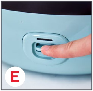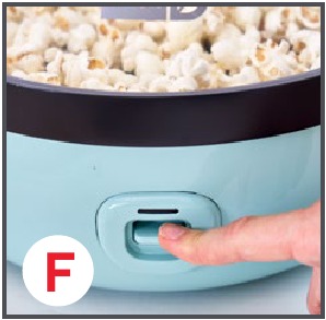 Se recomienda usar 1 cda de mantequilla por cada ¼ de taza de palomitas de maíz. - Presione el interruptor de encendido hacia abajo para comenzar a cocinar (foto E). Dependiendo de la cantidad de palomitas de maíz y el tamaño de los granos, puede tomar de 3 a 4 minutos para que las palomitas de maíz comiencen a reventar.