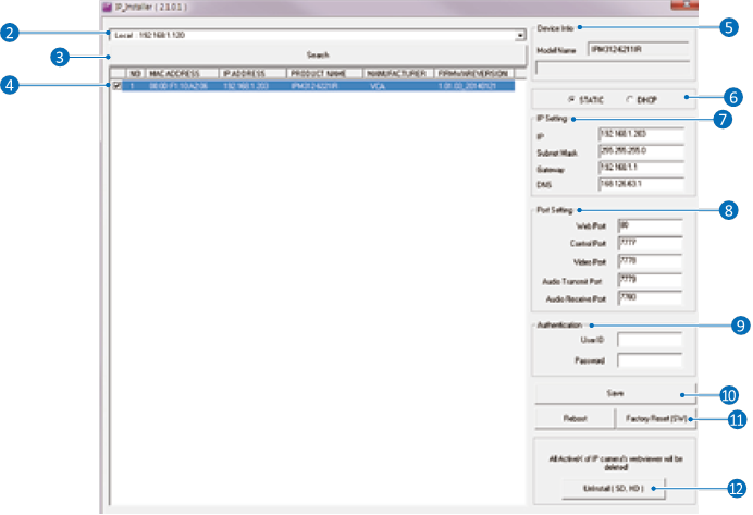 Seleccione una cámara (se pueden seleccionar varias cámaras) > Ingrese el ID y la PW (contraseña) > Haga clic en el botón Reboot (Reiniciar) o Factory Reset (Restablecimiento de fábrica).