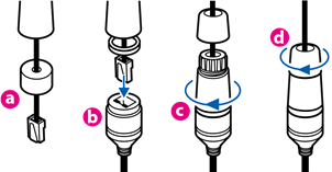 Inserte primero el cable Lan en la goma como (a) a continuación. Coloque el cable Lan en (b), luego (c) se ensamblará a (b) firmemente. Como paso final, (d) debe ensamblarse a (c) sin dejar ningún espacio.