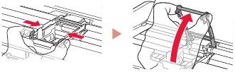 - Sostenga ambas pestañas de la palanca de bloqueo del cabezal de impresión y luego bájela.