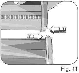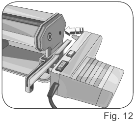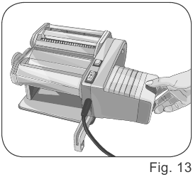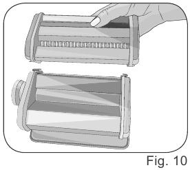 - Elija el formato de pasta que quiera preparar y monte el rodillo adecuado en la base (Fig. 10). Enganche el rodillo en los accesorios del rodillo (B) (Fig. 11).