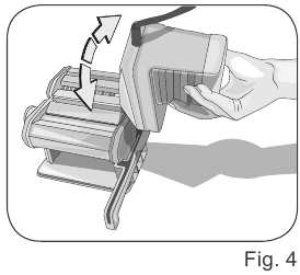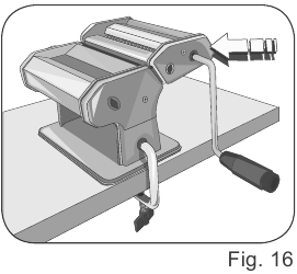 - Al final de cada uso, desenganche el motor del soporte. Extraiga el eje de transmisión o la manivela del orificio de los rodillos para lasaña o de uno de los orificios de los otros rodillos.