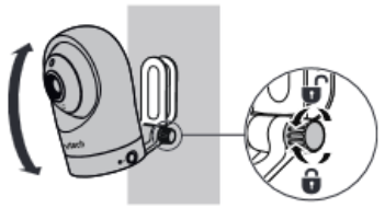 Sujeta la unidad para bebés y, a continuación, gira el mando en sentido contrario a las agujas del reloj. Esto aflojará la junta del soporte de montaje en la pared. Inclina tu unidad para bebés hacia arriba o hacia abajo para ajustarla a tu ángulo preferido. A continuación, gira el mando en el sentido de las agujas del reloj para apretar la junta y asegurar el ángulo.