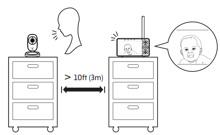 - Asegúrese de que la unidad de la cámara y la unidad para padres estén separadas por más de 3 metros (10 pies); O
